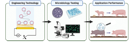 圖2. 創新策略概覽:工程技術提供對脂肪酸和單甘油酯如何破壞脂質膜的基礎見解;微生物學實驗讓研究人員可以在體外評估它們對具脂質包膜的病毒和細菌的抑制作用;而應用層面的性能研究則著重測試飼料添加劑對動物生長表現和傳染病防控的影響。