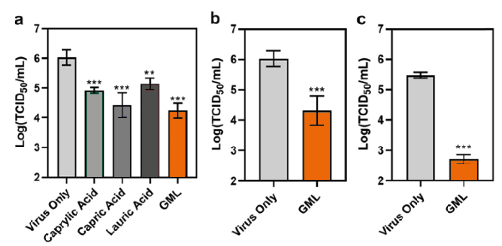 月桂酸的抗病毒性能高於其他脂肪酸。此外,以單月桂酸甘油酯(Monolaurin,簡稱 GML)的形式存在時,月桂酸的抗菌和抗病毒生物活性比游離月桂酸更強(此結論已在本文第一部分中討論過)。另一方面,二酸甘油酯和月桂酸的三酸甘油酯對微生物則沒有活性(Lieberman 等人,2006)。